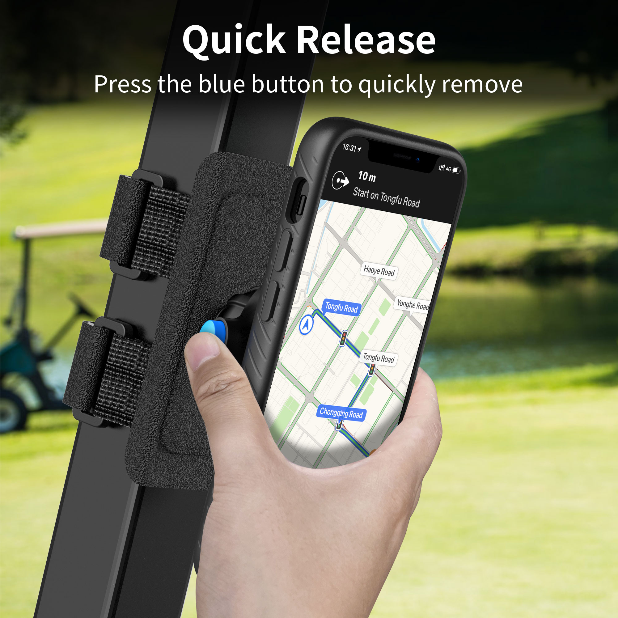 The Sportlink Golf Cart Strap Phone Mount is specifically designed to improve your golf game experience. It keeps your phone safe and at your fingertips. After being installed with the easy mounting adaptor on your phone case, you can quickly attach your phone onto the mount securely and detach easily in no time.